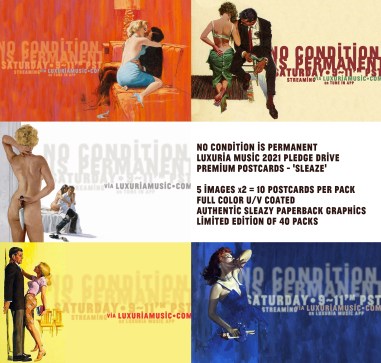 To help ensure that morally questionable programming as described above remains available to unsuspecting listeners worldwide, Luxuria Music NEEDS YOUR SUPPORT. Which is easy enough to do, simply by visiting the Luxuria Music Store and choosing either a Monthly Sponsorship option or else purchasing one of many items available therein. The No Condition Is Permanent store offers two new items for the 2021 FUN-Drive, these being: